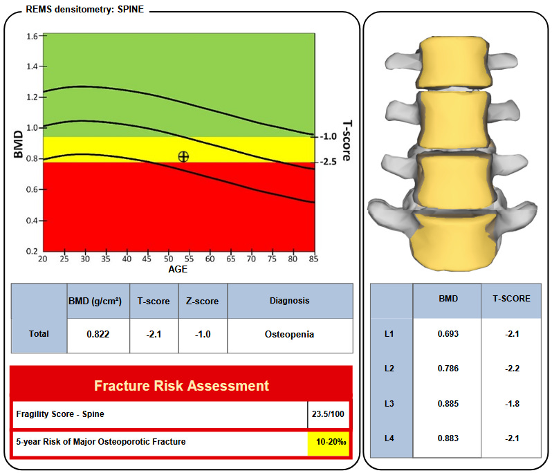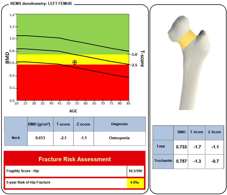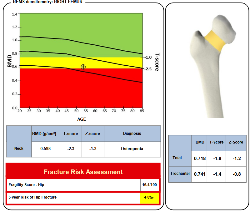 Although, as mentioned above, REMS assesses bone mineral density with accuracy comparable to DXA, what I was really interested in was the fragility score. And, as Nick stressed, bone mineral density and fragility score can be discordant – that is, your BMD can be low (which is conventionally considered to indicate elevated fracture risk) but your fragility score is low (which definitively indicates low fracture risk), or vice versa.