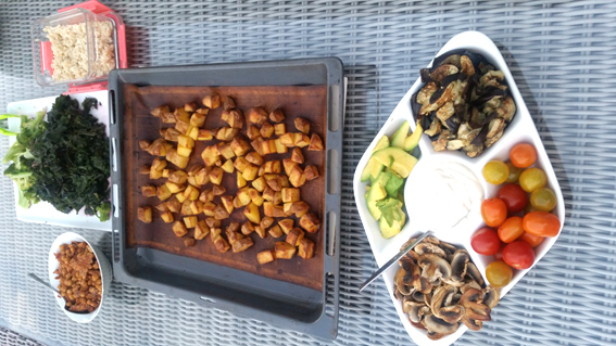 Place ingredients in the middle of the table and let each diner craft their own Buddha Bowl, topping with Tofu Cashew Mayonnaise.