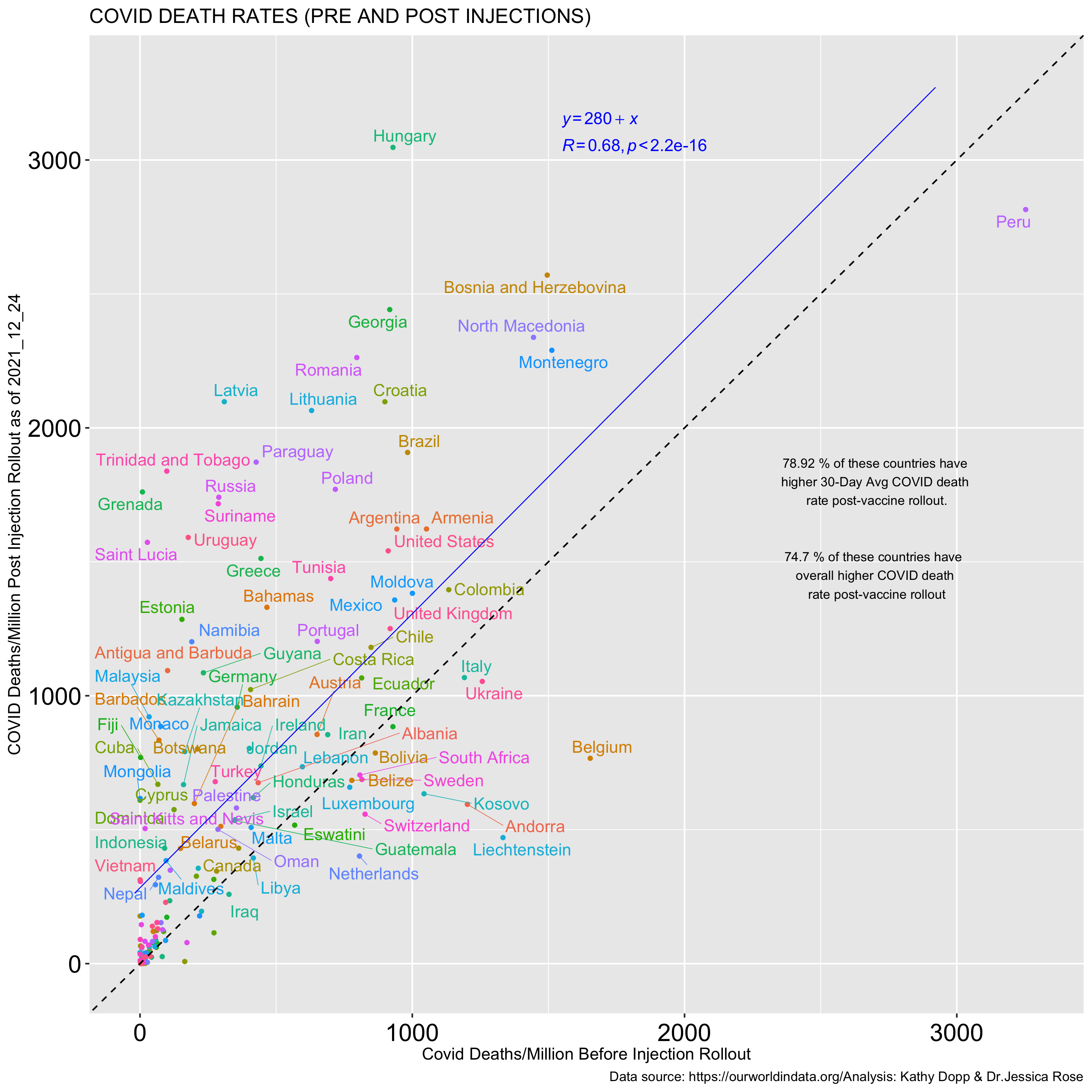 Looking at countries with low, moderate and high COVID-19 deaths per million population (graphs below from Kathy Dopp), it’s clear that the majority of countries have higher COVID death rates after their vaccine rollouts than before and that, tragically, many countries that had essentially zero deaths from COVID-19 before they began injecting their populations – such as Taiwan, Laos, Tanzania, Vietnam, Cambodia, Fiji and Timor-Leste – are now seeing their death rates shoot up: