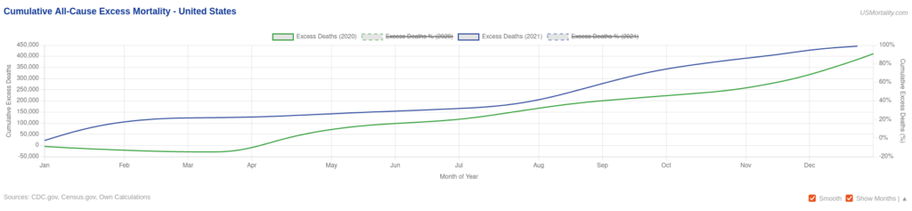 In the US, excess mortality has been higher for all of 2021 (up 15% on expected deaths) than 2020 (up 13.6%).