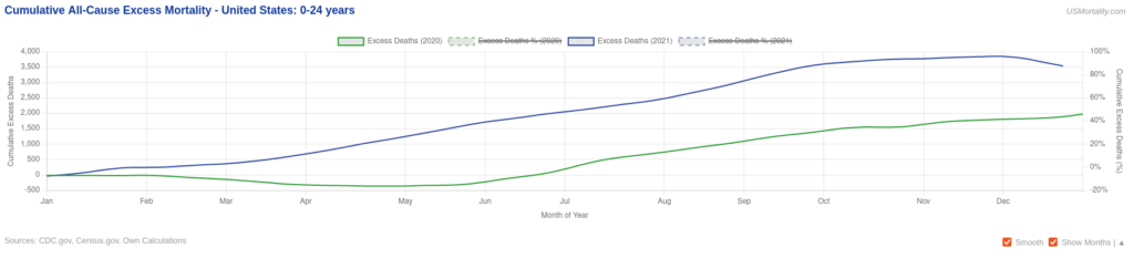 Once again, the greatest excess mortality is seen in younger age groups that have an exceptionally low risk of dying of COVID-19, but have been exposed en masse to experimental injections. For 0-24 year olds, excess mortality in 2021 was close to double what it was in 2020: