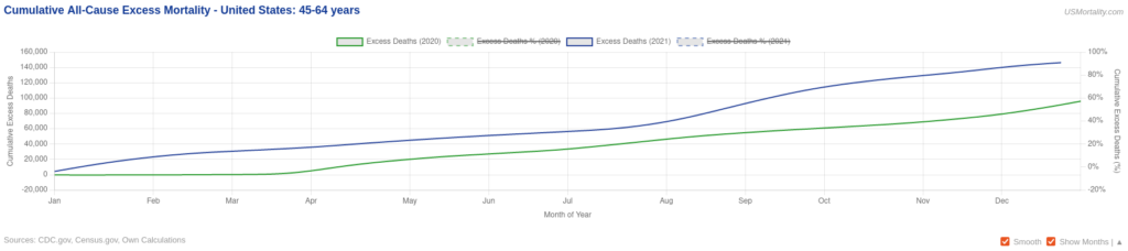 25-44 year olds and 45-64 year olds also had significantly higher excess mortality in 2021 than in 2020: