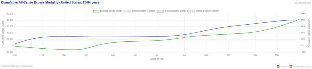 75-84 year olds had roughly equivalent excess mortality in both years, and the 85+ group had higher excess mortality in 2020 than in 2021, indicating a harvesting effect as would be expected given the carnage that occurred in US nursing homes in 2020.