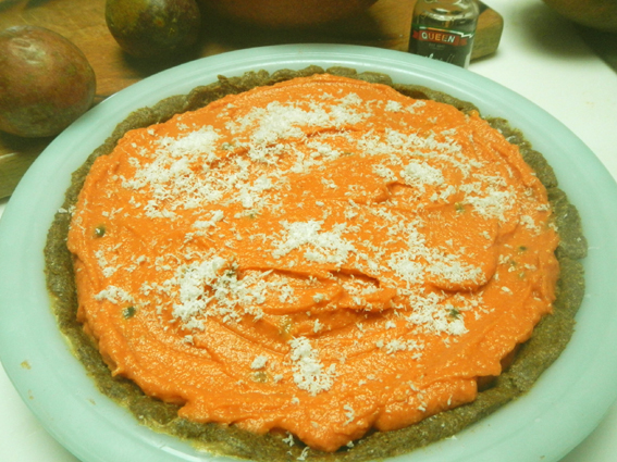 In a high-powered blender, grind cashews finely, then add sapite flesh and vanilla. Stir in passionfruit pulp. Scoop filling into pie crust and sprinkle with coconut.