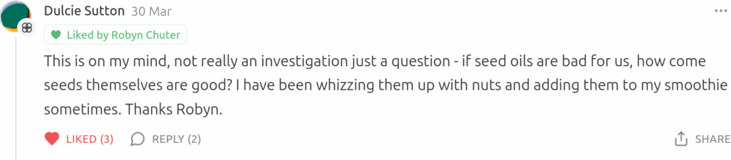 And so, Dulcie, that is the answer to your question: seeds are indeed good for us, and seed oils are not bad for us. I’m not going to be adding them to my diet anyway, and you don’t have to either if you don’t want to. But at least you can cross this one off your list of things to worry about.