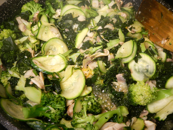 Stir in zucchini and mushroom, cover and cook until all vegetables are tender – 2-4 minutes depending on how finely you sliced them, stirring regularly and adding more water if they begin to stick to the pan.