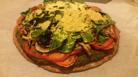 Break dough into four equal sized balls and allow to rest for 15 minutes. Roll into pizza shapes and bake at 200°C for 10 minutes. Add toppings and bake for another 5-10 minutes or until toppings are completely warmed through. Spinach burns rapidly, so add it after 5 minutes of cooking.