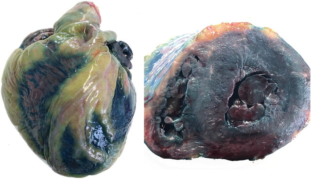 Likewise, methylene blue is avidly taken up by red blood cells, perhaps explaining why it can also stain the heart “pistachio blue”: