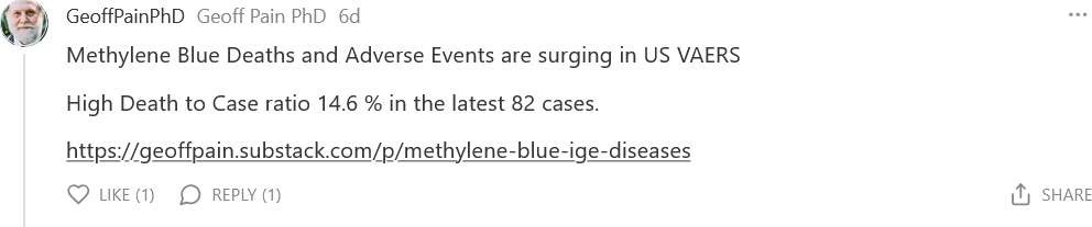 I wonder how many cancer and Parkinson’s patients started taking methylene blue after hearing a ‘wellness influencer’ spruik its benefits, and then ended up in hospital – or the morgue – with a serious drug interaction? Well, Geoff Pain left this comment on Part 1…