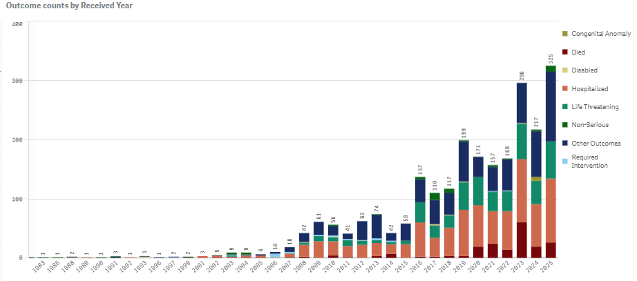 And, as Geoff noted, examination of case reports shows that the case fatality rates are accelerating. Is the widespread promotion of methylene blue encouraging both doctors and patients to use it for conditions for which there’s no convincing evidence of benefit? It appears so: the phrases “Product Used For Unknown Indication”, “Off Label Use”, “Product Use In Unapproved Indication” and “Drug Ineffective For Unapproved Indication” appear in case reports of deaths involving methylene blue with increasing frequency from around 2022-2023.