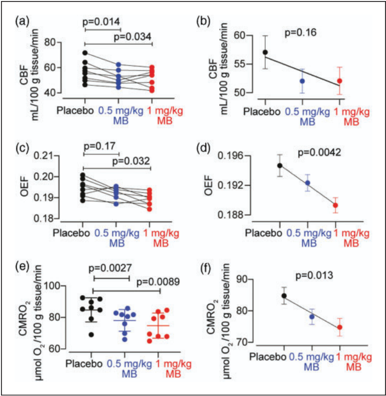 (b) group CBF means +/- SEM values and regression line. Both MB doses significantly decreased CBF but no dose-dependent effect was observed. (e) CMRO2 values derived from CBF and OEF for individual participants, with both MB doses showing significant reduction from placebo (d, f) group OEF and CMRO2 means SEM values and regression line. MB-induced reductions relative to placebo were dose-dependent.