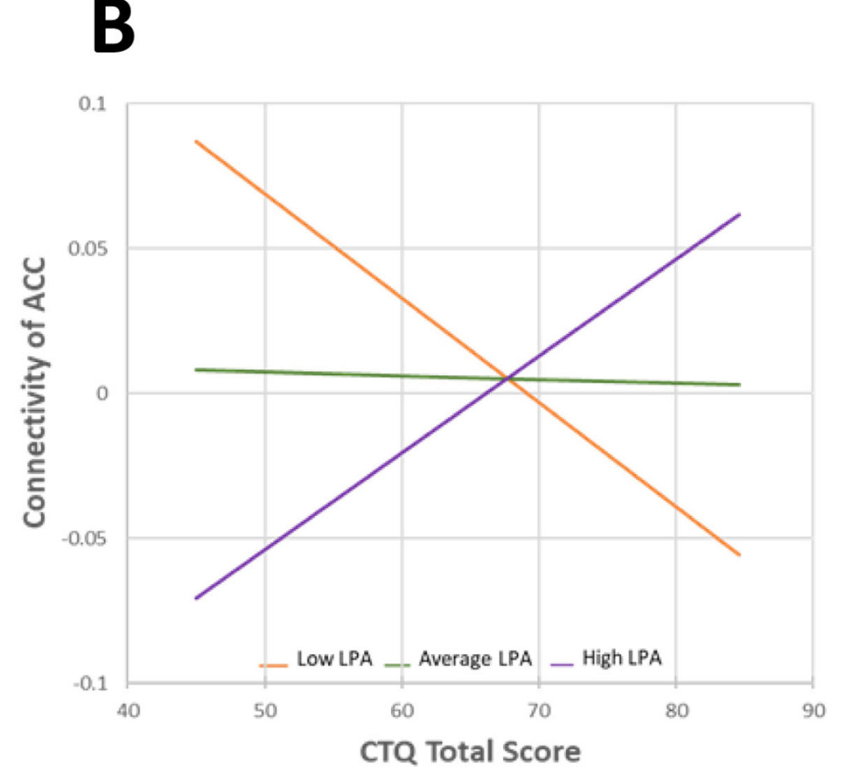 Adults who had endured more adverse childhood experiences had less connectivity between the amygdala and anterior cingulate cortex if they had been less physically active throughout their lives, but more connectivity if they had been more active. The figure below illustrates the relationship between amygdala-anterior cingulate cortex connectivity and lifetime physical activity level: