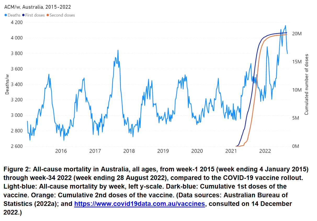 Over the measured period of the step-wise increase in all-cause mortality (mid-April 2021 through August 2022; 14 % larger all-cause mortality than in recent pre-vaccination periods of same time duration; 62 million administered vaccine doses) there are 31±1 thousand excess deaths of all causes in Australia, whereas no excess deaths are detected in the prior 13-month period since a pandemic was declared (mid-March 2020 through mid-April 2021).”