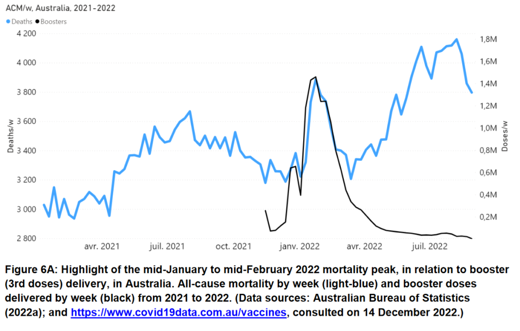 “Starting in mid-April 2021, the all-cause mortality per week in Australia shows a sustained increase of >10 %, during which it never returns to its seasonal low value (of approximately 3,000 deaths/week) and attains highs of >4,000 deaths/week in June-July-August 2022…