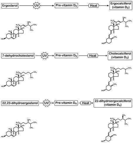 None of the other food sources of vitamin D3 contain sufficient concentrations of it to make a meaningful contribution to vitamin D nutriture, but there is one type of food that yields another calciferol compound – ergocalciferol, or vitamin D2 – that can be converted into 25-hydroxyvitamin D2 and thence into calcitriol: mushrooms. Strictly speaking, ‘shrooms do produce cholecalciferol, as well as yet another related compound, 22-dihydroergocalciferol, or vitamin D4, but only in small amounts.