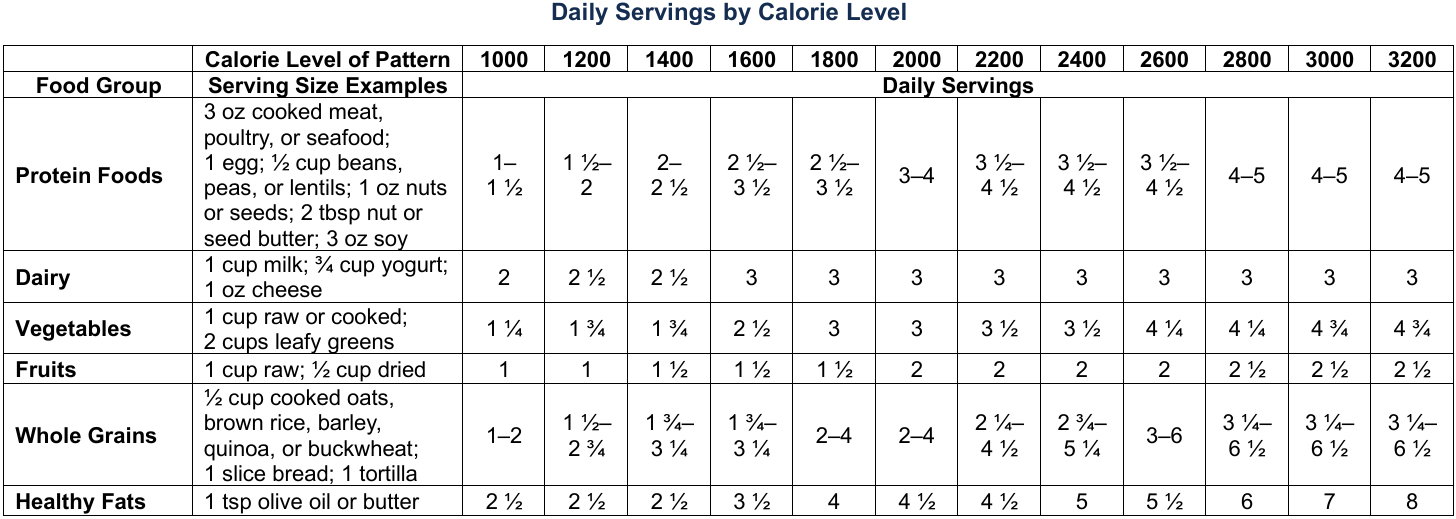 It gets even more nuts when you peruse the Daily Servings By Calorie Level document, which gives specific guidance on the number and size of servings of each food group: